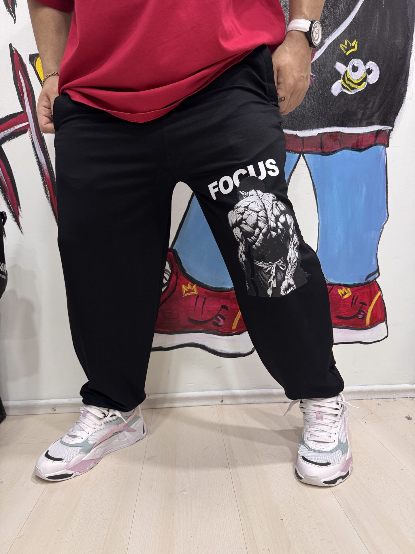 Focus Baskılı Motivasyonu Yüksek Siyah Esnek Çift Derin Cepli Siyah Eşofman Alt