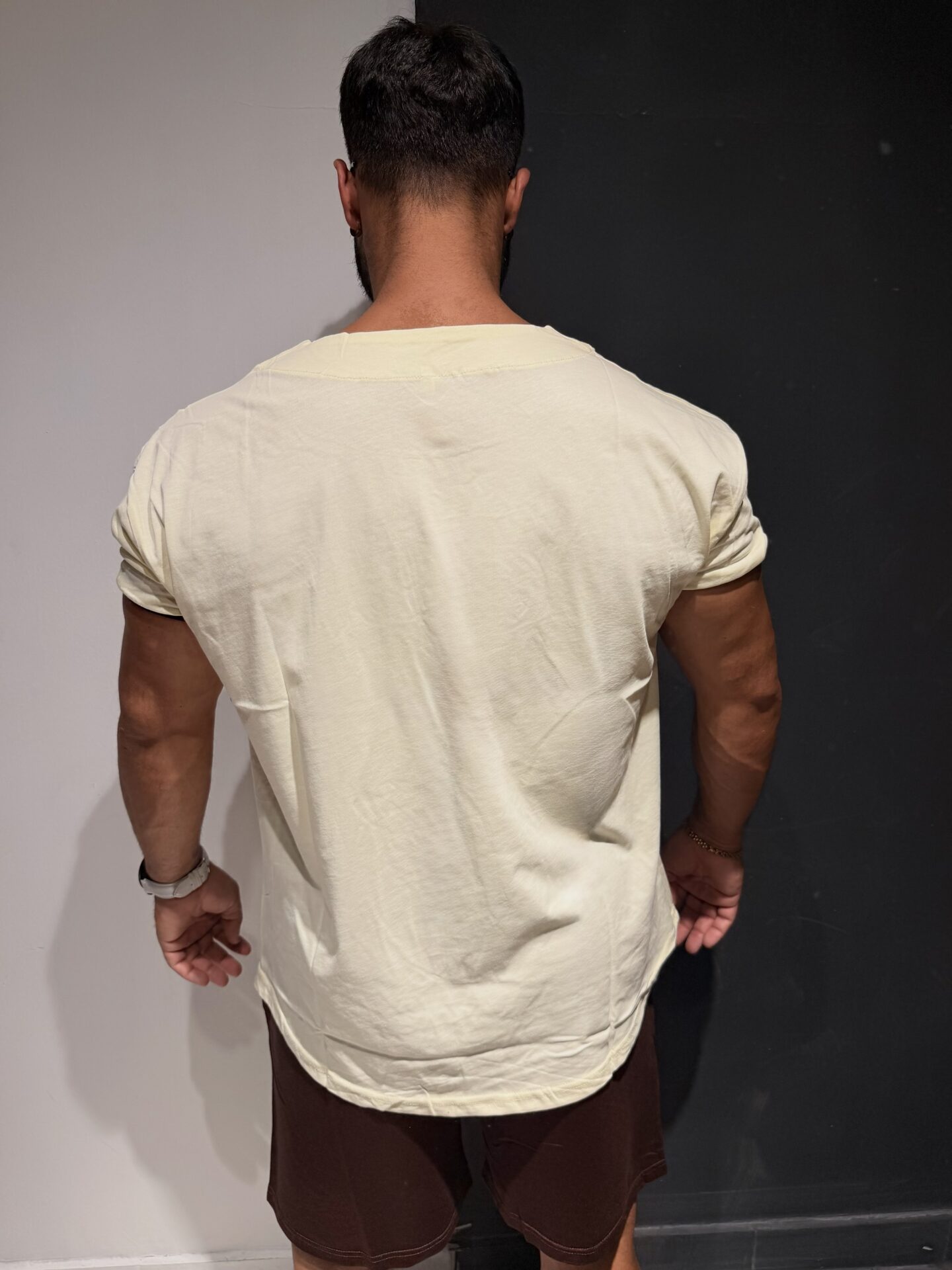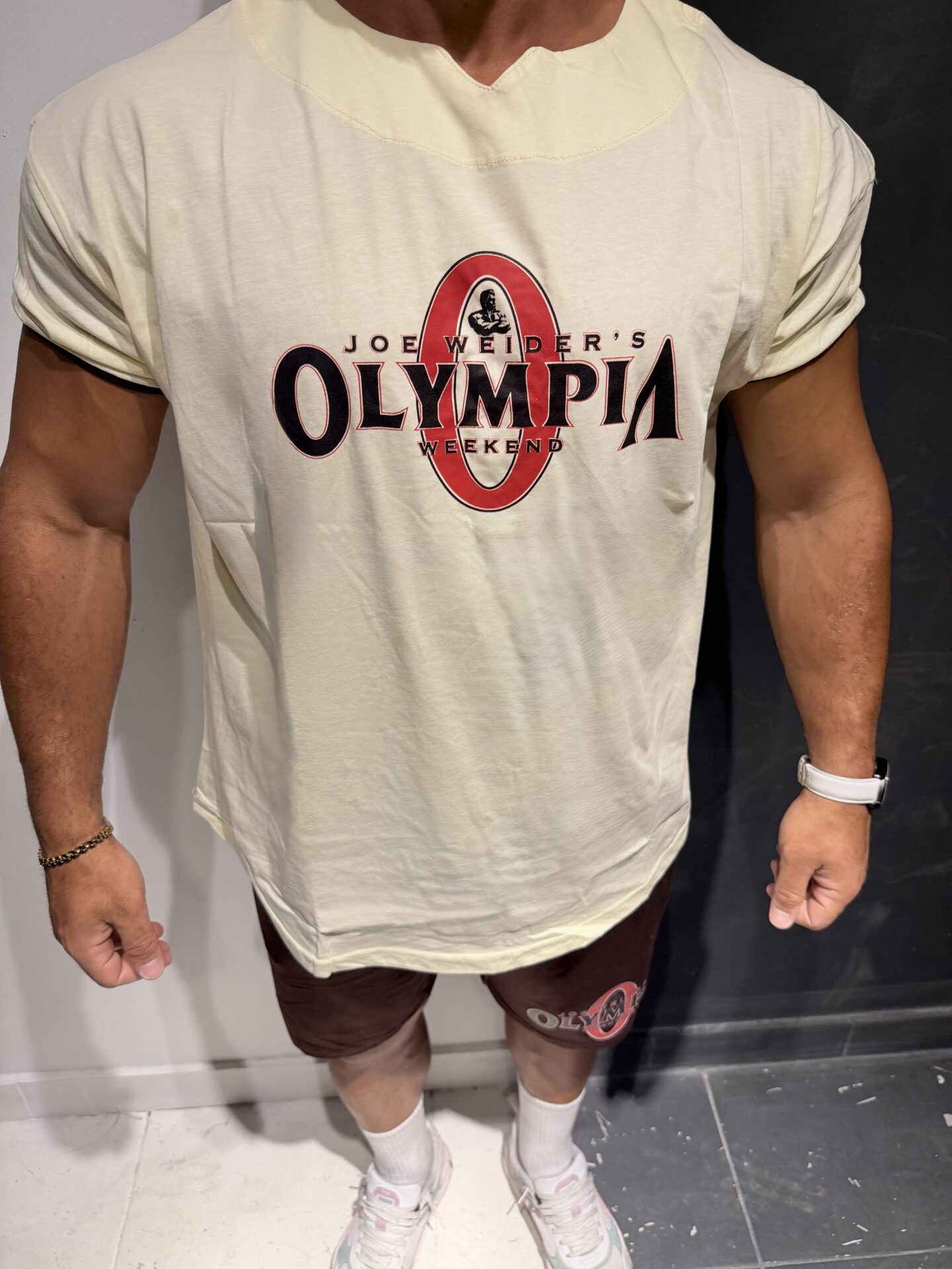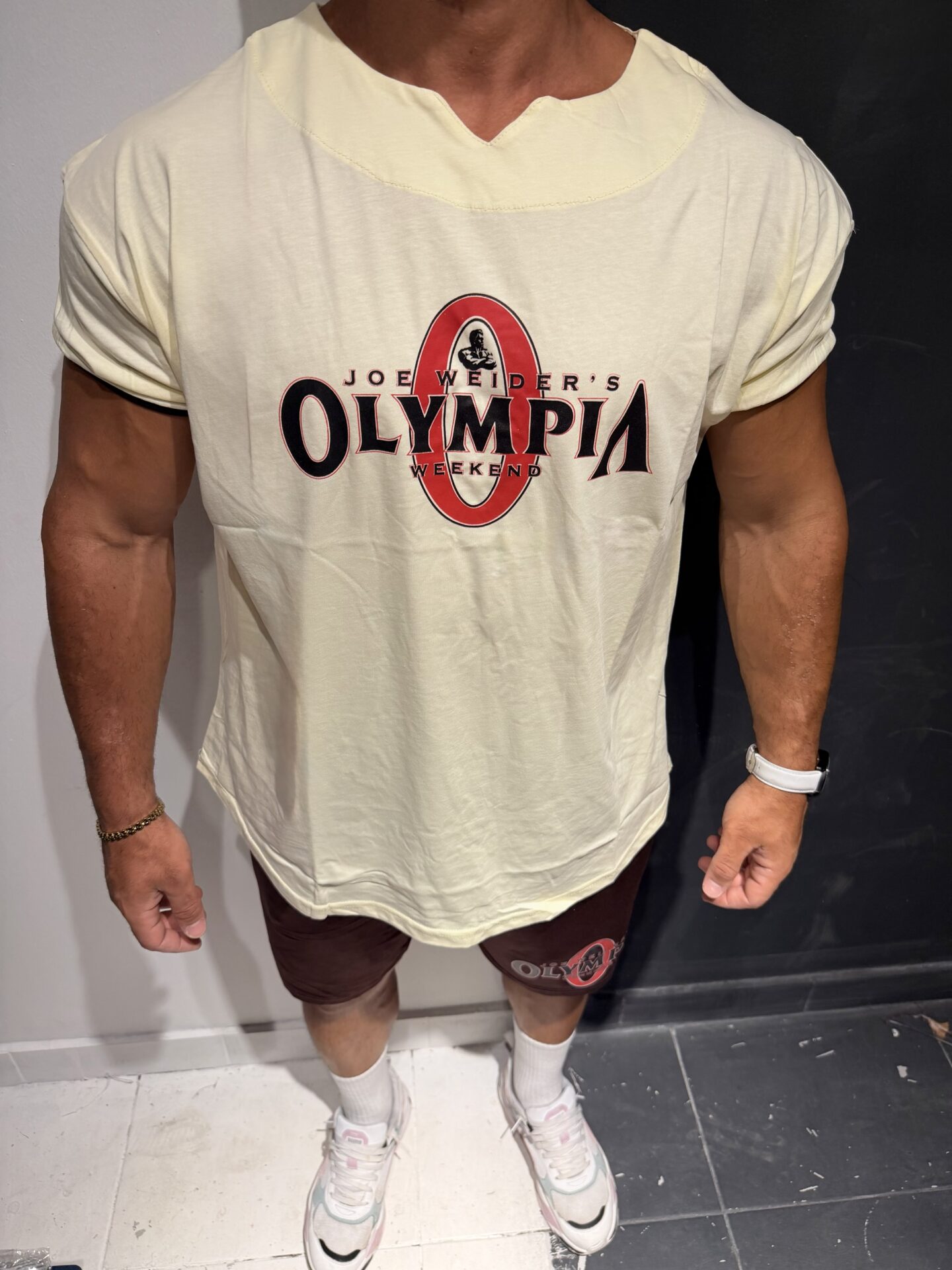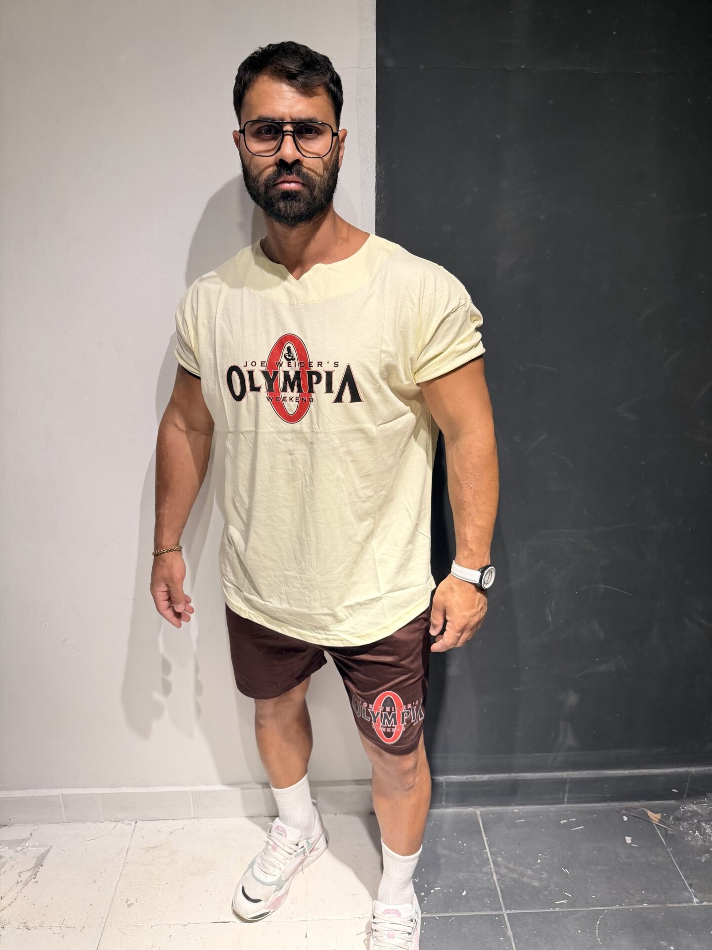 Olympia Baskılı Açık Toz Sarı Dar Kol Oversize Model Kollar Lastikli Oval Kesim %100 Pamuk Fitness Ve Günlük Tişört