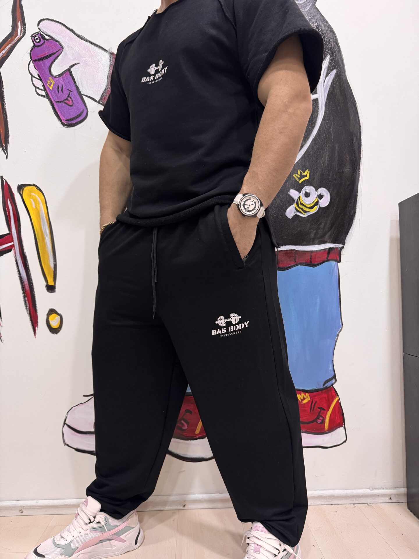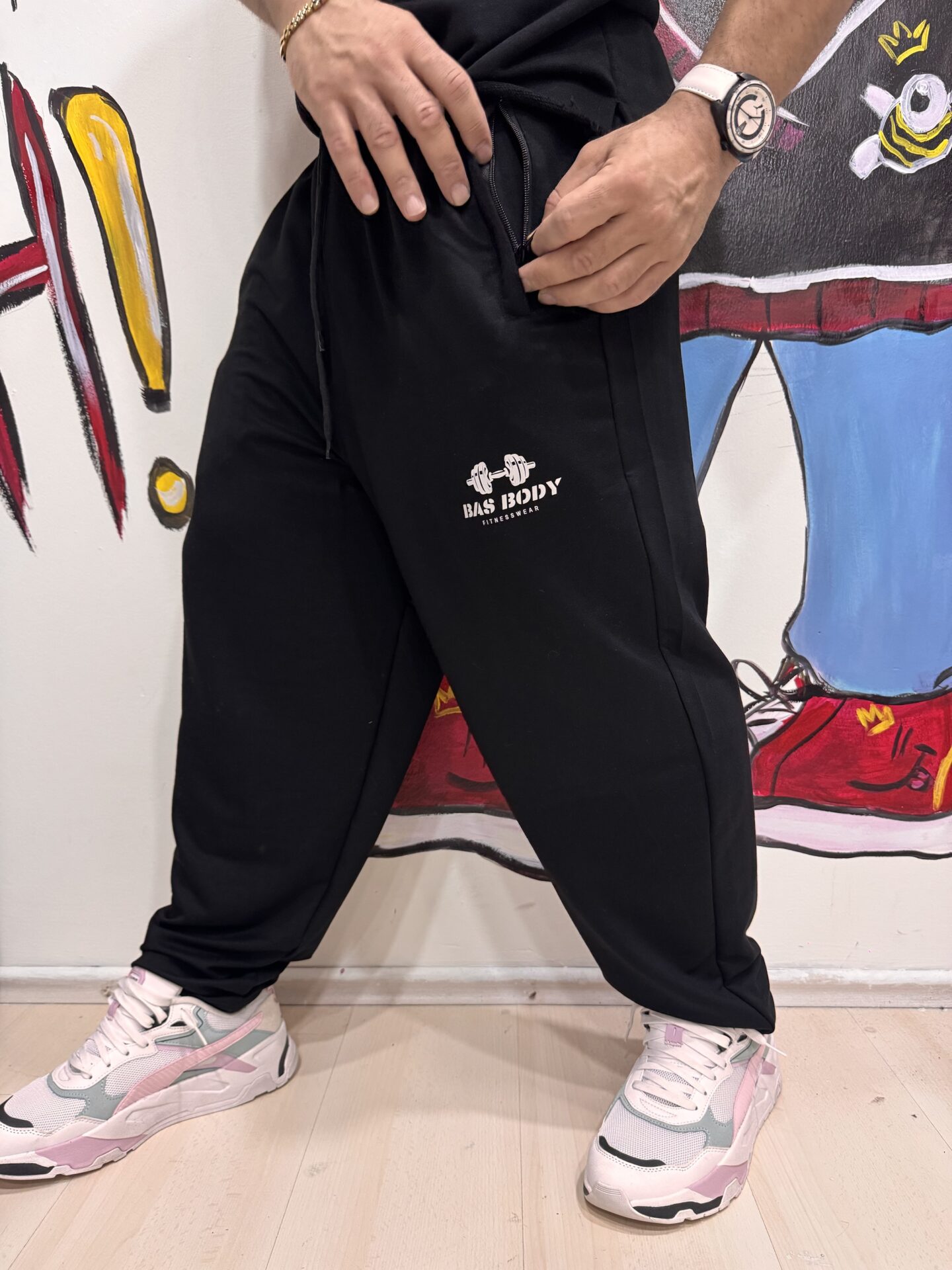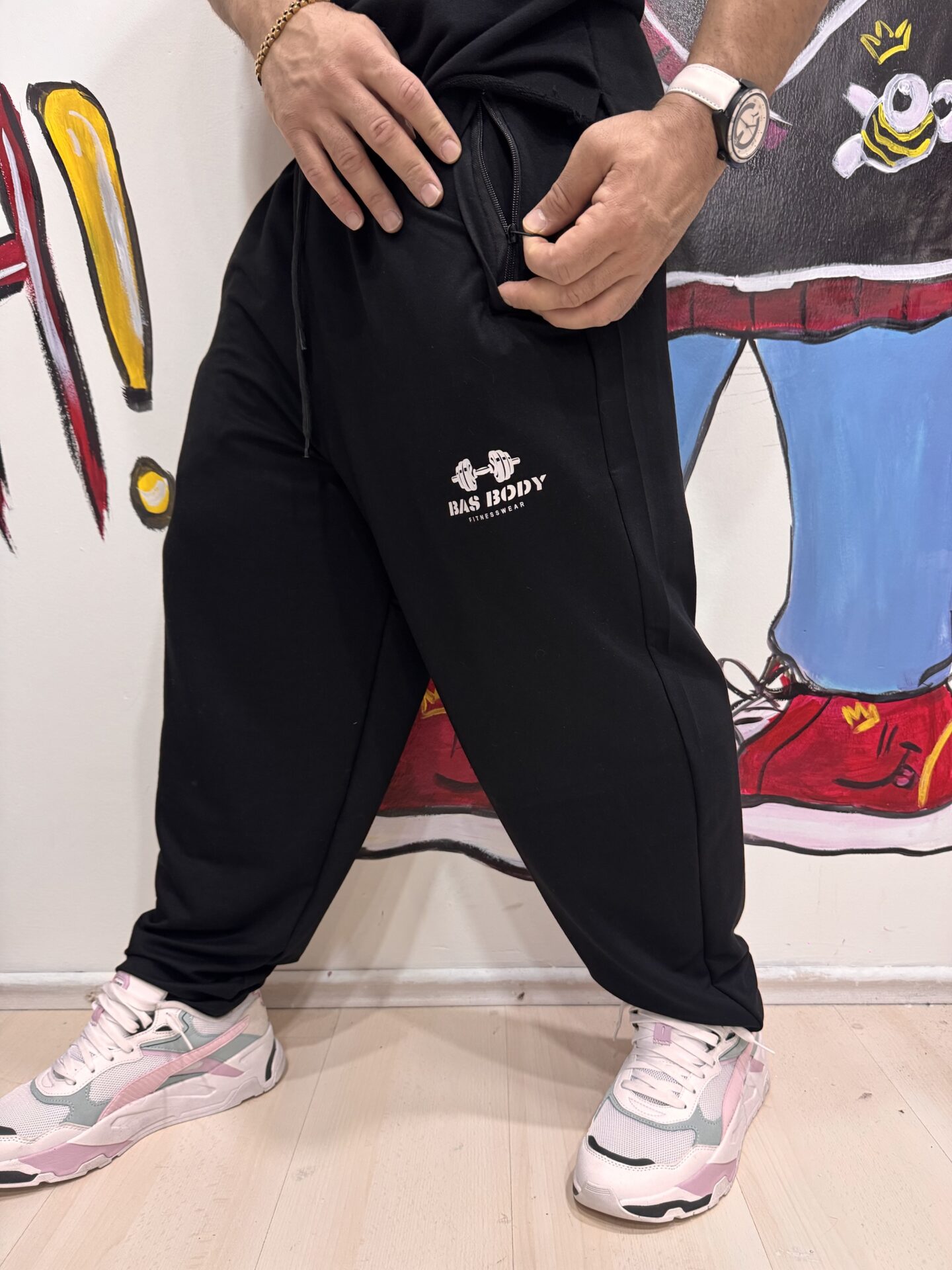 Bas Body Logolu Fitness Ve Günlük Kullanıma Uygun Çift Derin Fermuarlı Cepli Siyah Eşofman Alt Esnek Likralı