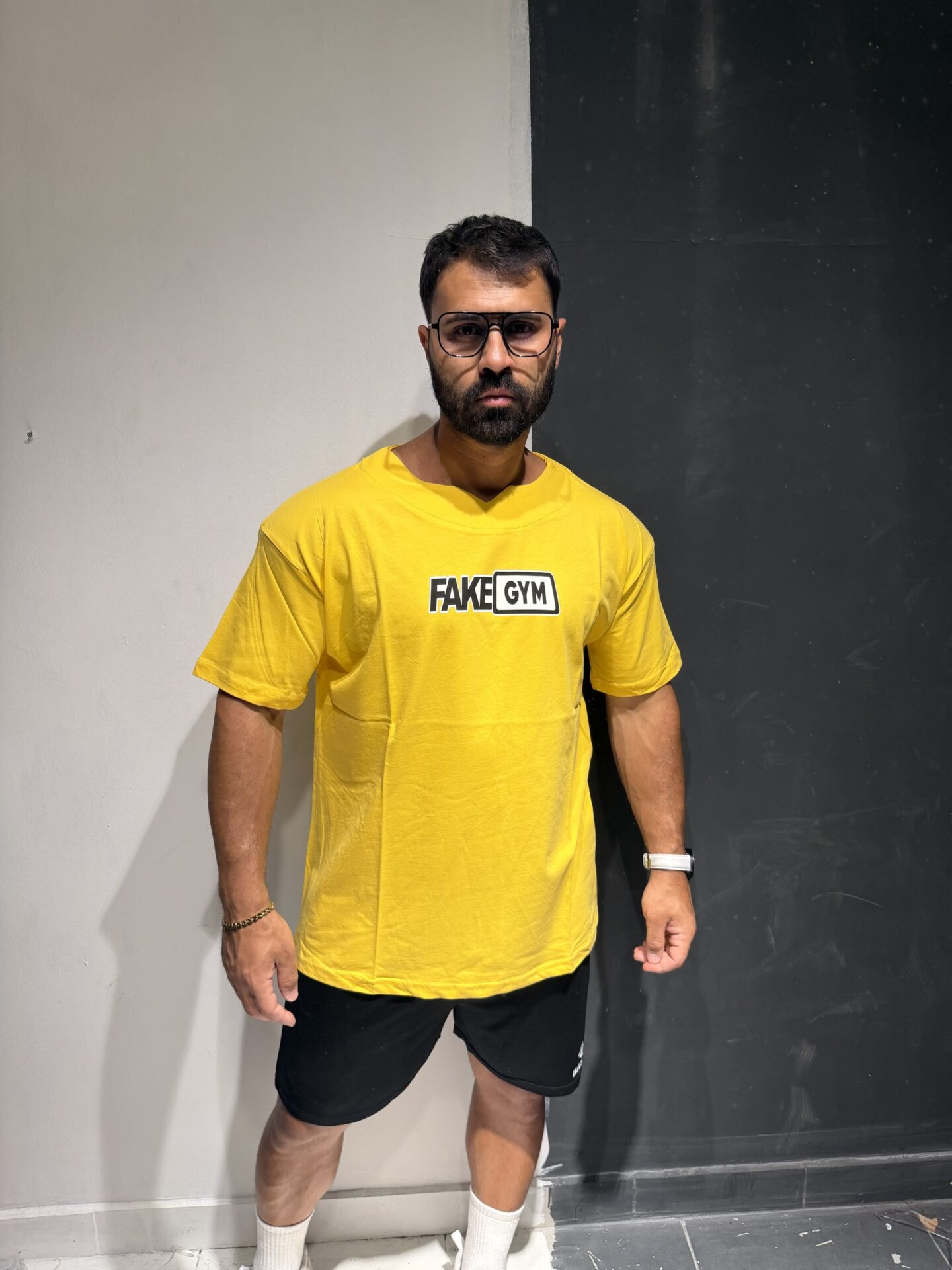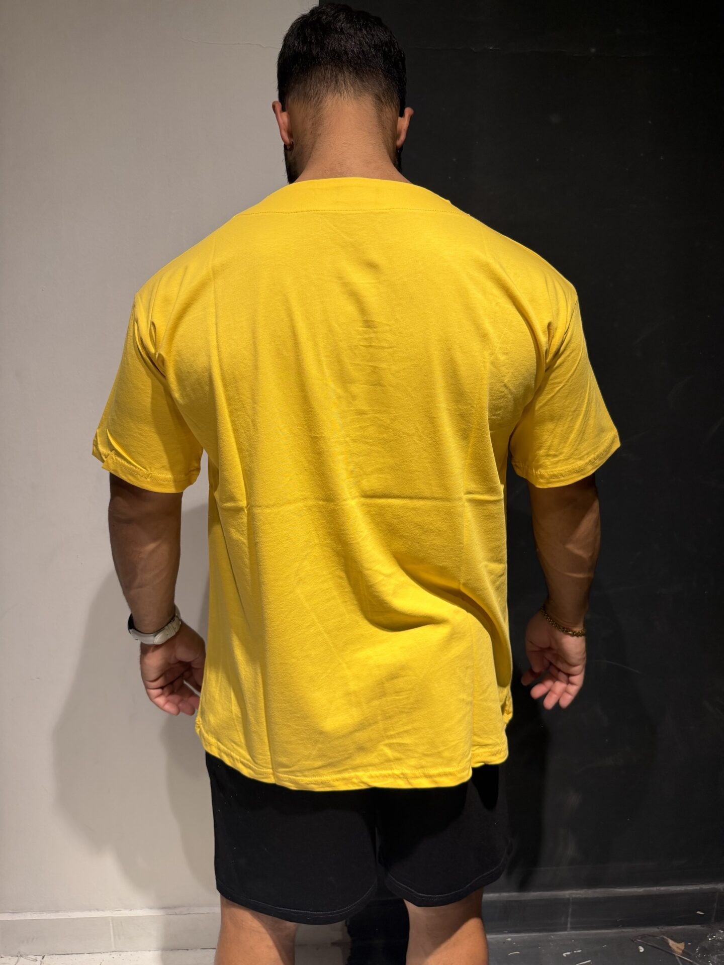 Sarı V Yaka Fake Gym Baskılı Oversize Fitness Tişört