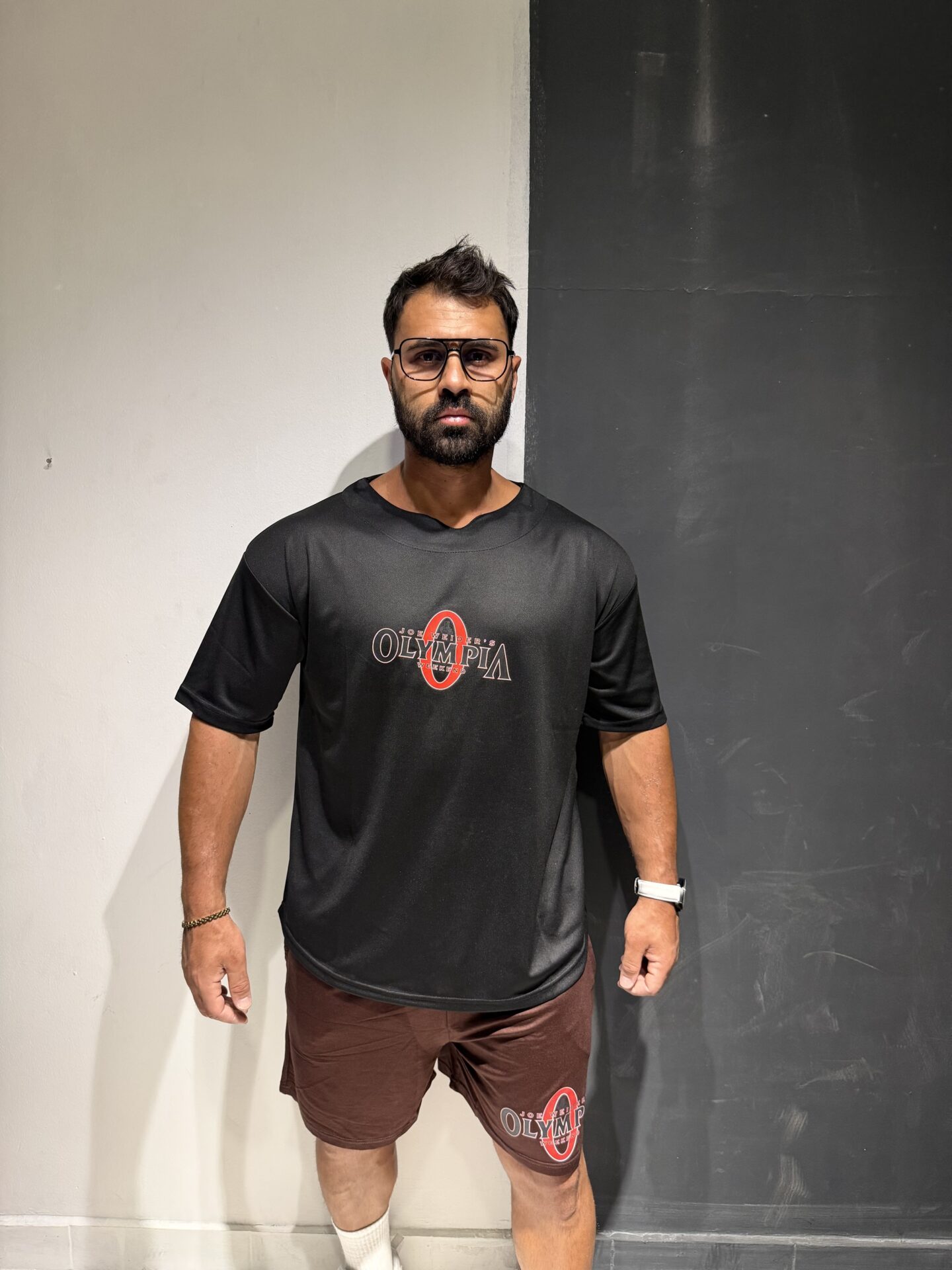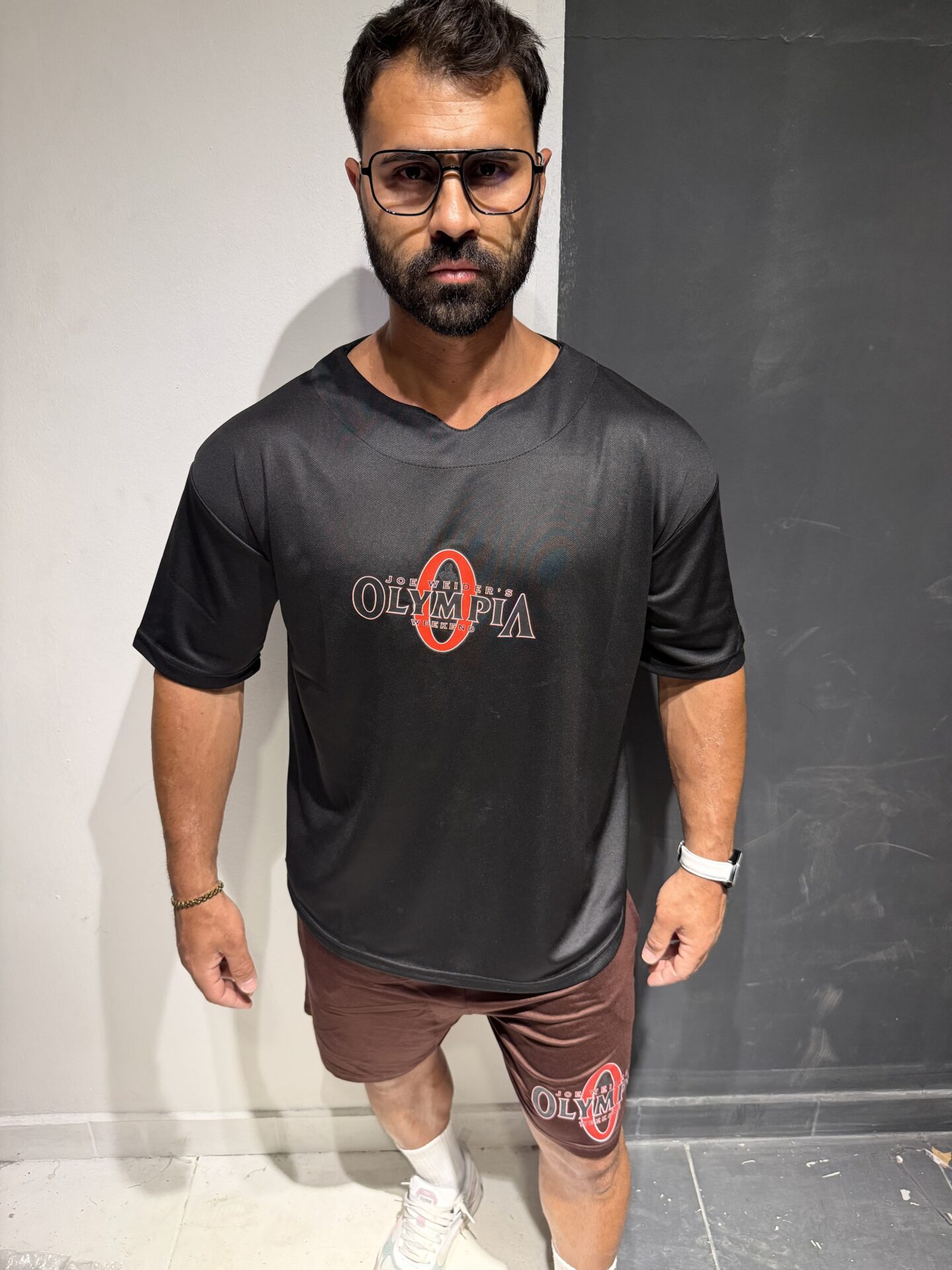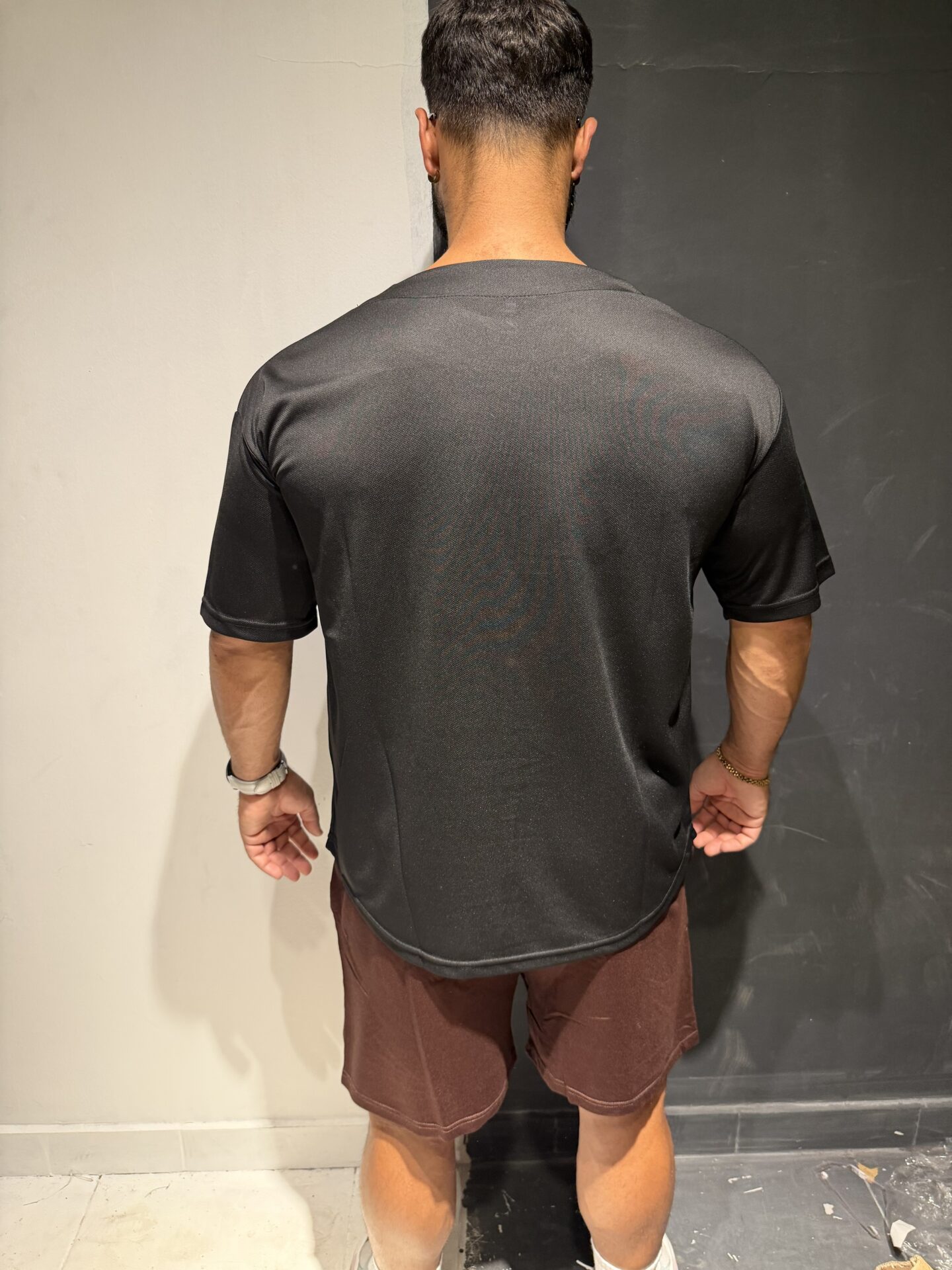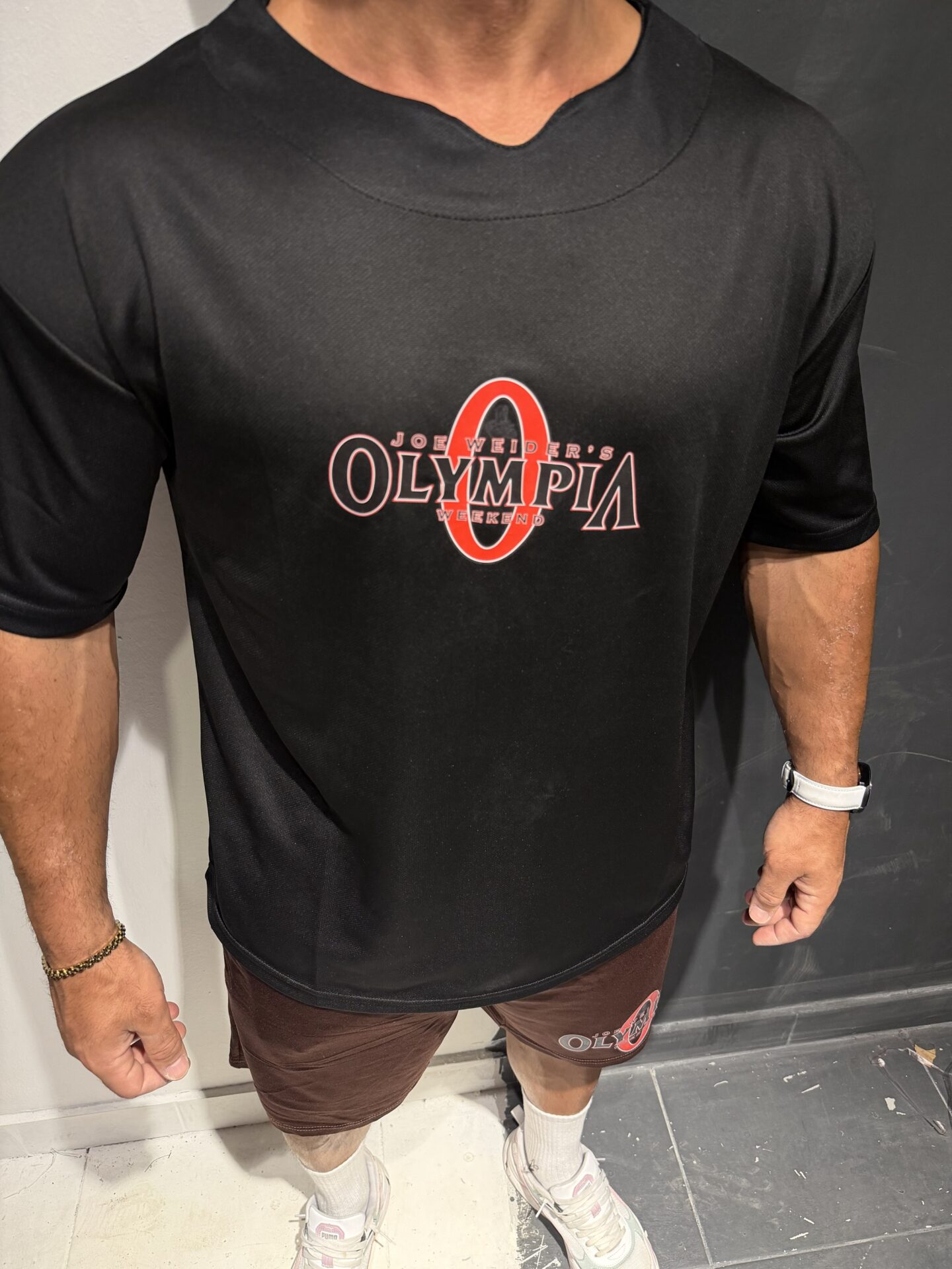 Siyah Olympia Baskılı Delikli Relax Kumaş V Yaka Oversize Kısa Kol Tişört